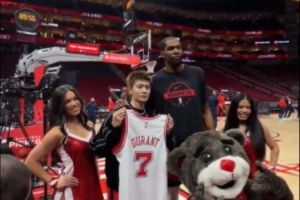 赛前,任嘉伦现身火箭主场,为杜兰特送上唐装作为礼物,后者送上签名球衣+合影留念。