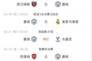 4月国际比赛日后,曼城将在联赛对阵切尔西和阿森纳!
