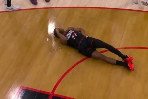 上半场最后一攻,埃奇库姆反击追身三分出手,被身后追防的卡特·布莱恩特撞到失去平衡摔倒,背部着地受伤离场,76人官方随后宣布埃奇库姆背伤不会回归。