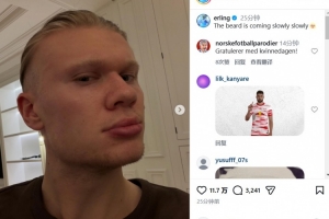 在社交媒体上,哈兰德延续了自己一贯不苟言笑的风格,他晒出了自拍照并写道:胡须一点点长出来了。