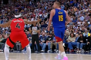 GIF-约基奇抢到前场篮板造成巴恩斯犯规