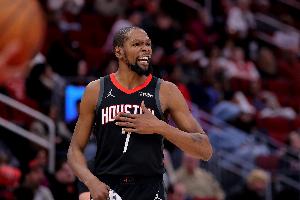 第三节,火箭球星杜兰特火力全开,单节9中6独得16分,三节打完21投11中,三分7中2、罚球4中4砍下28分4篮板3助攻,正负值+9。