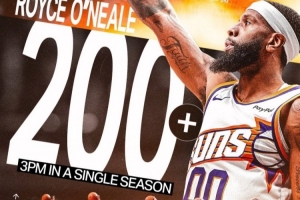 据太阳官方统计,这是奥尼尔赛季第200记三分,是队史第六个达到这一成就的球员。
