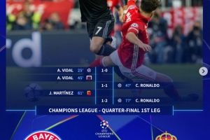 比达尔在首回合取得进球后失点,哈马两黄变一红,C罗双响帮助皇马逆转取胜;次回合,莱万、C罗先后进球,拉莫斯乌龙、比达尔两黄变一红被罚下。加时赛,C罗双响、阿森西奥建功。